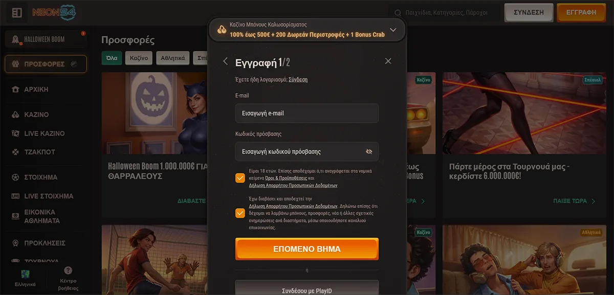 Η δημιουργία λογαριασμού στο Neon54 είναι μια απλή διαδικασία που εγγυάται ότι οι παίκτες στην Ελλάδα μπορούν να αποκτήσουν γρήγορα πρόσβαση στη δράση του παιχνιδιού. Αρχικά, οι χρήστες πρέπει να επισκεφτούν το neon54.com και να εντοπίσουν το κουμπί "Εγγραφή". Με ένα μόνο κλικ, οδηγούμαστε σε μια φόρμα εγγραφής που ζητάει βασικά στοιχεία από τους νέους χρήστες. Κατά τη δημιουργία του λογαριασμού σας, ας επιβεβαιώσουμε ότι το email και ο κωδικός πρόσβασής είναι ασφαλείς και αξιομνημόνευτα, καθώς θα είναι τα κλειδιά για την πρόσβαση στην περιοχή του καζίνο.